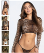 Go wild for style in this gorgeous microfiber crop top set featuring a long sleeved leopard top with solid cups, a high round neckline, a cage style back band with lace detailing, and a matching g-string panty.
