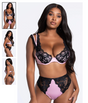 You'll see beauty everywhere in this exquisite two-tone bra set featuring pink satin underwire cups with a black lace overlay, adjustable spaghetti straps with split open lace detailing, a hook and eye back closure, and a matching high waisted thong panty with a satin crotch panel and a back keyhole.