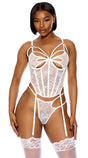 Tempt and tease your forever love in this flirty lace bustier set featuring sheer underwire cups with strappy detailing, adjustable spaghetti straps, a sheer bodice with built-in boning, a hook and eye back closure, adjustable garter straps, and a matching thong with a single and double strapped waistband. (Veil and thigh high stockings not included.)