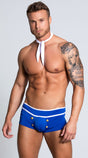 Set sail to sexy in this Men's Sailor Salute lingerie costume featuring a blue boxer short with a white trim, gold button accents, and a matching white neck tie.