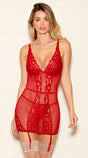 Snuggle up with some hot coco and sweet kisses with your babe in this sassy chemise set featuring a V-neckline, sheer lace, underwire cups, a satin bow detail, adjustable spaghetti straps, a double strapped back band with a hook closure, a low back, a sheer mesh and lace bodice, removable adjustable garter straps, and a matching panty. (Thigh high stockings not included.)