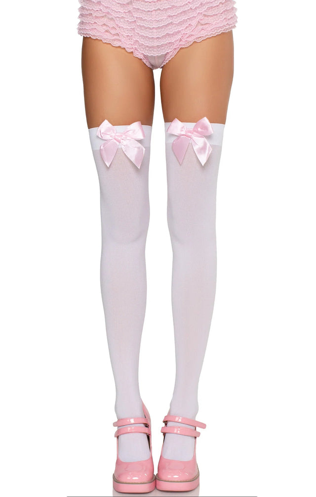 Let your legs do the talking in the Kay Opaque Thigh Highs by Leg Avenue. This absolutely stunning pair of women's stockings features and ultra-flattering, snug fit topped with a beautiful satin bow. Pair with your favorite sexy lingerie for an unforgettable look!
