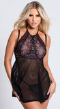 Feel like a flirty babe in this babydoll set featuring sheer lace underwire cups, a lace up front, halter ties, a purple lace bust, adjustable spaghetti straps, a hook and eye back closure with a keyhole, a sheer mesh bodice with a loose skirt, and a matching thong.