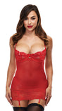 This classically sexy chemise set features underwire shelf cups with peekaboo lace panels, adjustable spaghetti straps, a sheer mesh bodice, a hook and eye back closure, an open back panel, a satin bow accent, a thick lace hem, adjustable garter straps, and a matching panty. (Thigh high stockings not included.)
