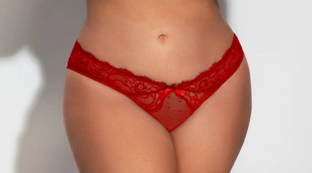 Eyelash lace and dot mesh cheeky panty with satin ribbon bow.