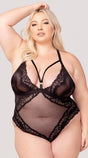 Give your lover a sultry surprise in this exclusive plus size teddy featuring sheer lace cups, a strappy bust with O-ring accents, adjustable spaghetti straps with a strappy lace racerback, O-ring accents, a sheer mesh and lace bodice, an open back panel with a hook and eye closure, and a cheeky cut back.