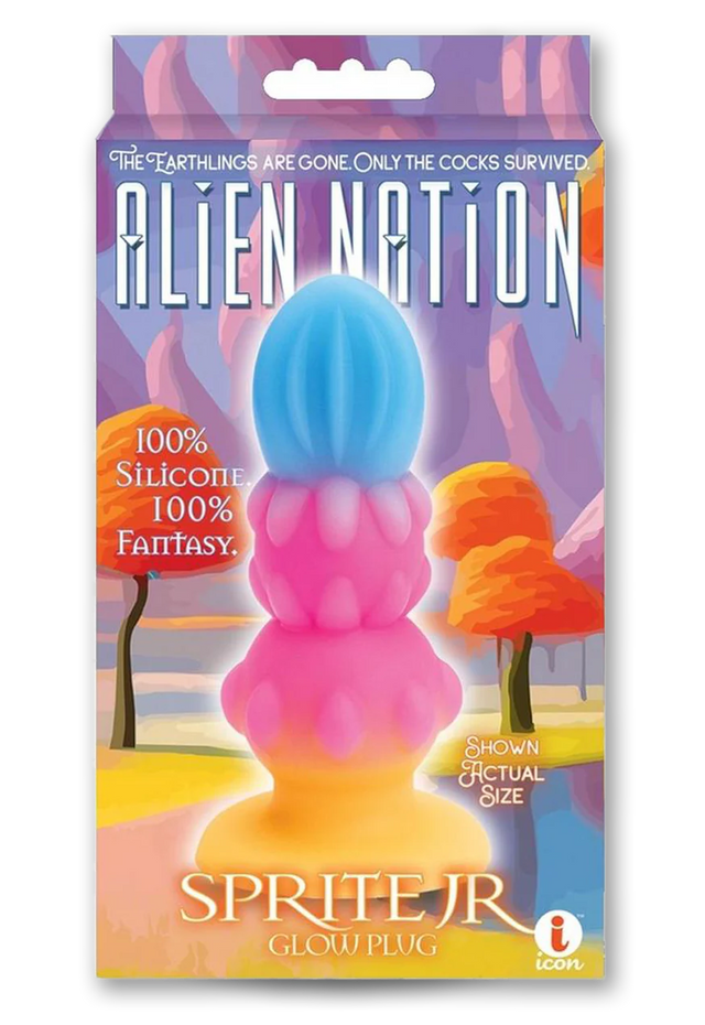 The Sprite Jr. Story: Suddenly a small neon butt plug unexpectedly emerged as a peculiar yet bewildering presence in the apocalyptic forest. With its vibrant glow, mischievous demeanor and especially discreet size, it became known as “Sprite Jr.” As it skipped across the shattered remnants of a past civilization, the Aliens marveled at its well-evolved nubs and ridges that tickled and teased quite