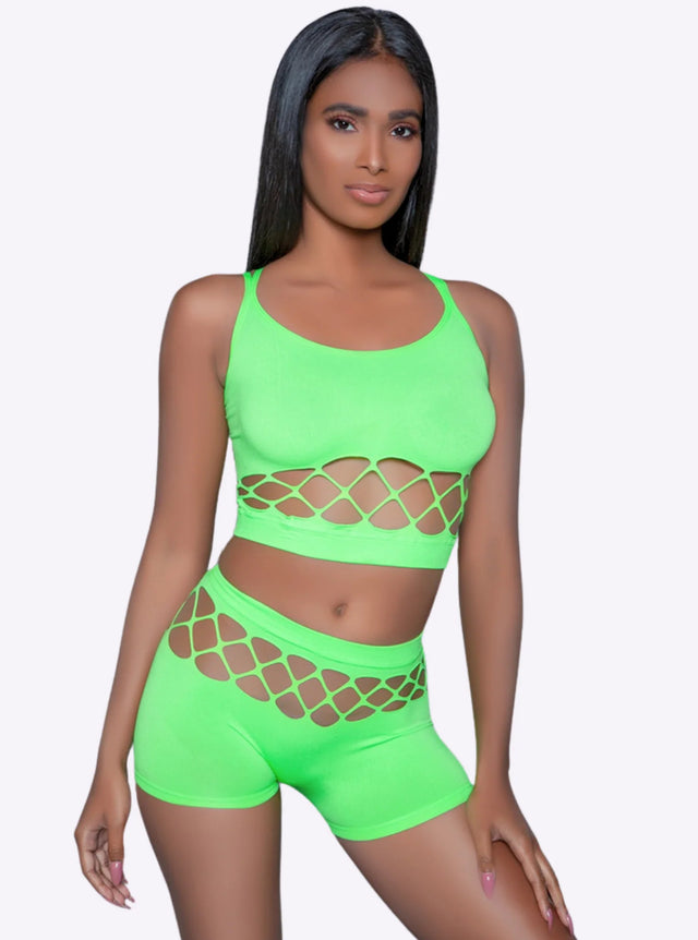 2 pc fishnet set that includes a tank crop top with criss-cross cami straps and a pair of high waisted booty shorts.