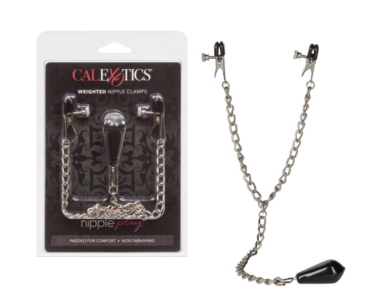 The teasing and tantalizing clamps are made from non-tarnishing, nickel-free iron and measure 1.75”/4.5cm. The fully adjustable mini clamps have soft, comfortable phthalate free PVC pads and easy twist screws for personal pleasure adjustment. The clamps are attached together via a sturdy high-quality iron chain that is adorned with a decorative weighted pendant, weighing 4.5 oz./13kg. The added weight increases sensual stimulation and intensifies nipple sensitivity. To maximize the experience, apply a hardening arousal gel or quality lube to the nipples for attaching the weighted clamps.