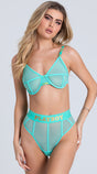 Keep your connection casual. Reveal a sporty retro vibe in the bedroom with this absolutely captivating Playboy Exclusive bra set featuring full coverage sheer piped underwire cups, adjustable elastic shoulder straps with repeating gold Playboy detailing, a hook back closure, and a matching high cut panty with a logo elastic waistband, and a thong cut back.